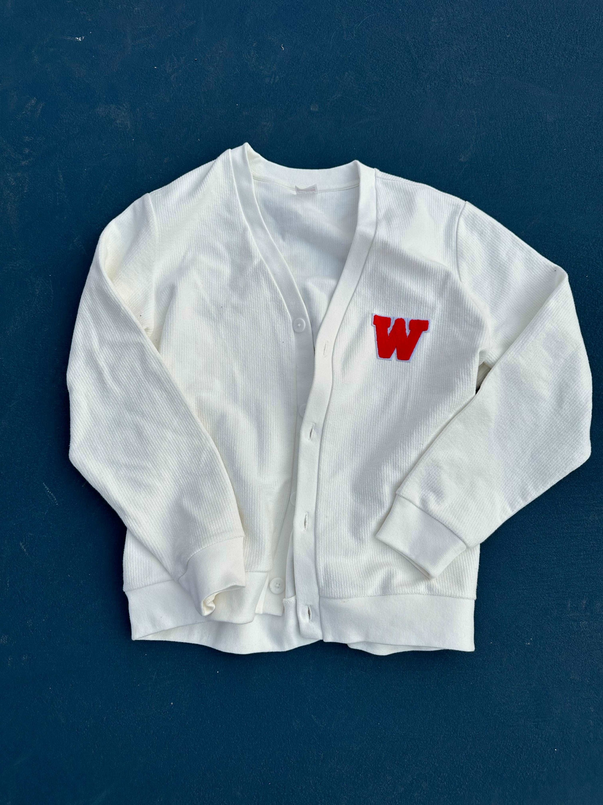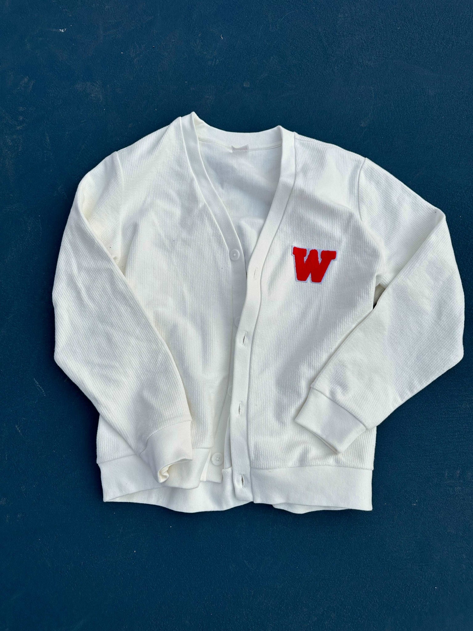 Chenille patch cardigan with your choice of letter and letter color. Model is shown wearing a size M.