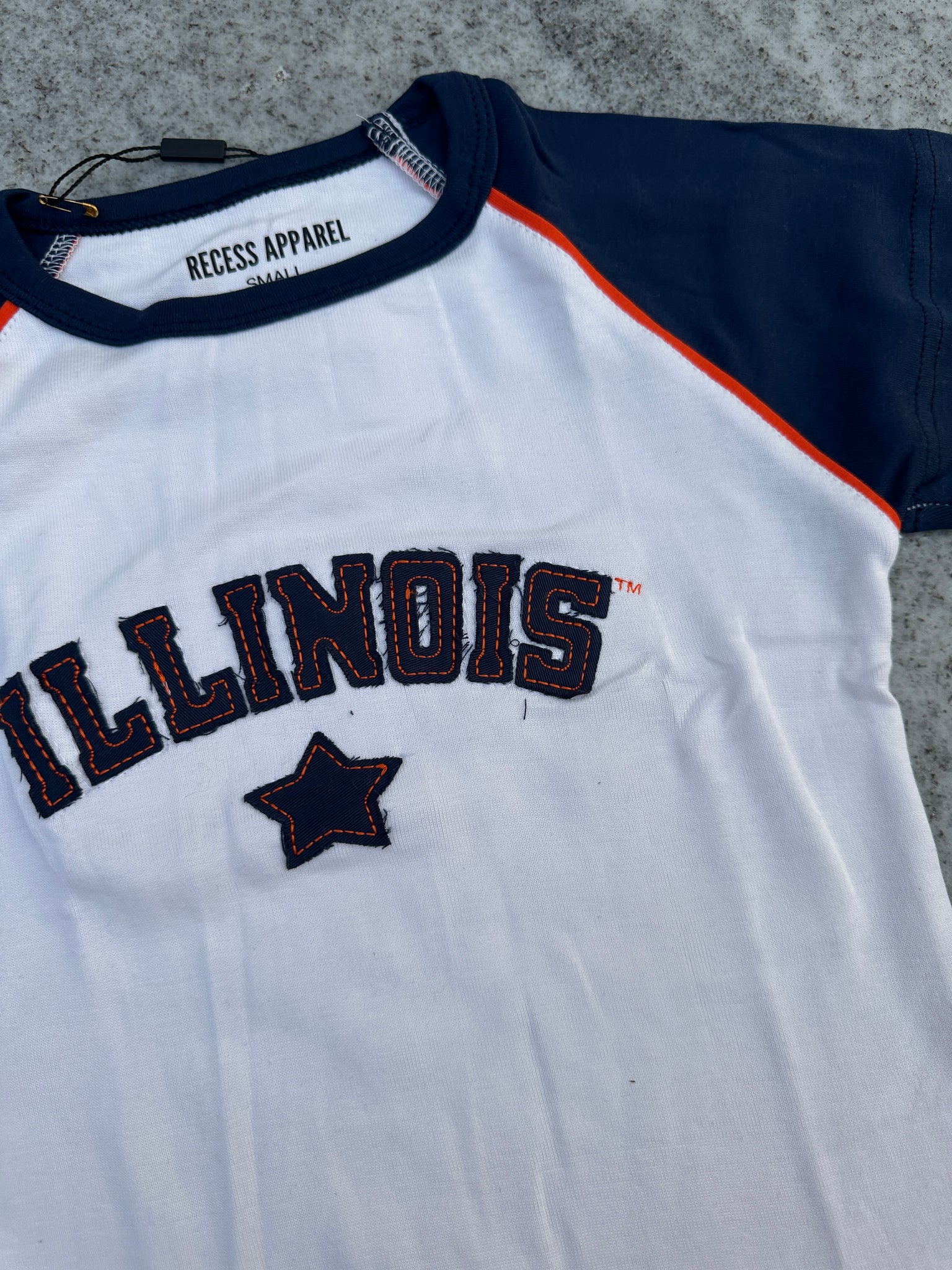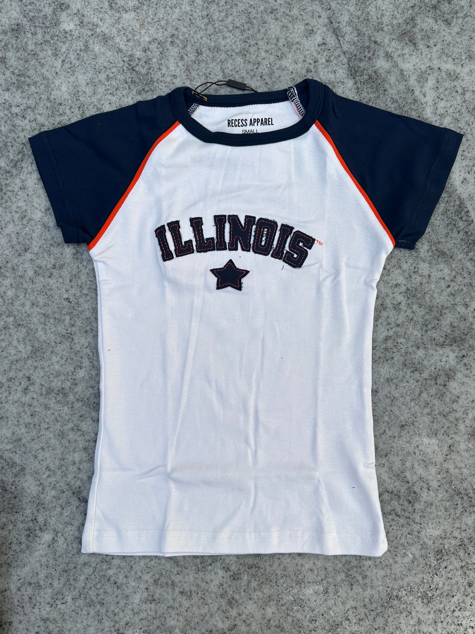 Show off your Illinois pride with our Illinois Star Baby Tee! Made of soft cotton-polyester blend, this cropped tee features a cut-out Illinois design and raglan style sleeves, perfect for game day. Stay comfortable and stylish while cheering on your favorite team!