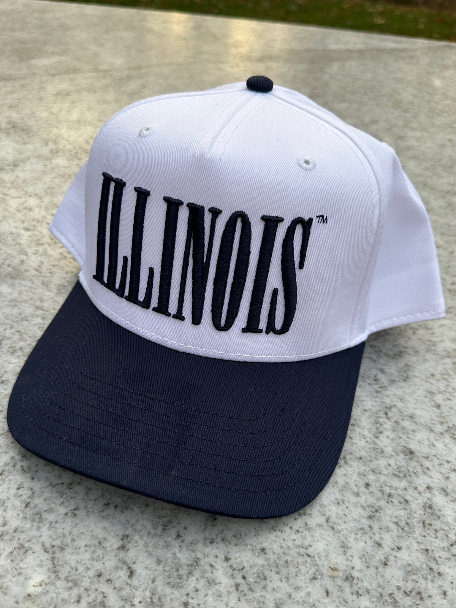 Two tone mid profile cap with oversized and raised Illinois embroidery.