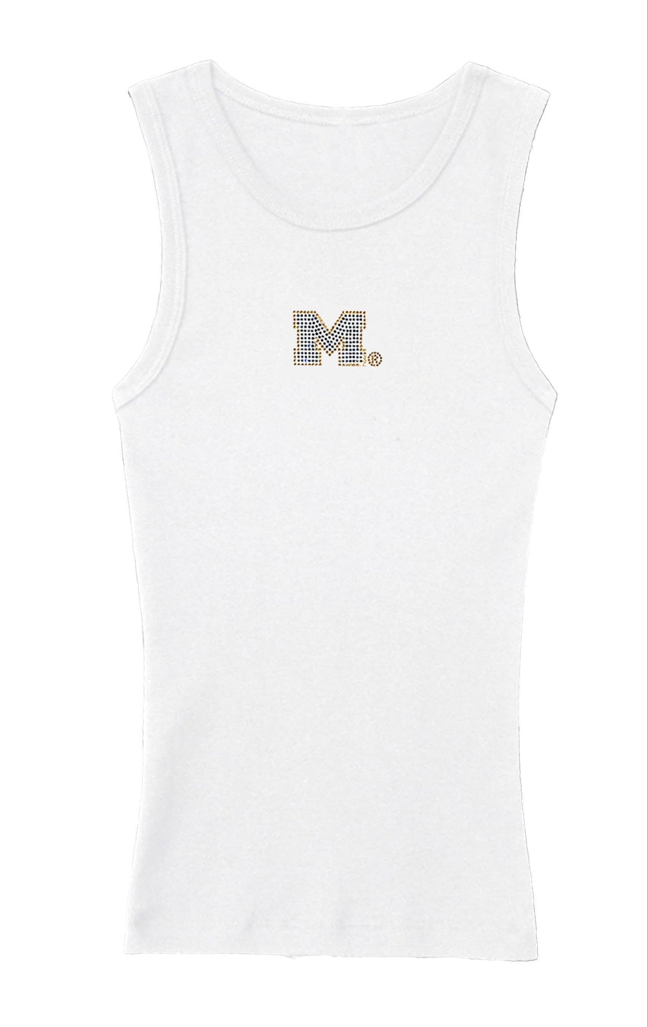 Upgrade your game day wardrobe with the M Rhinestone Gym Tank! This high neck ribbed tank features a crystal rhinestone Michigan M, perfect for showing off your school spirit.
