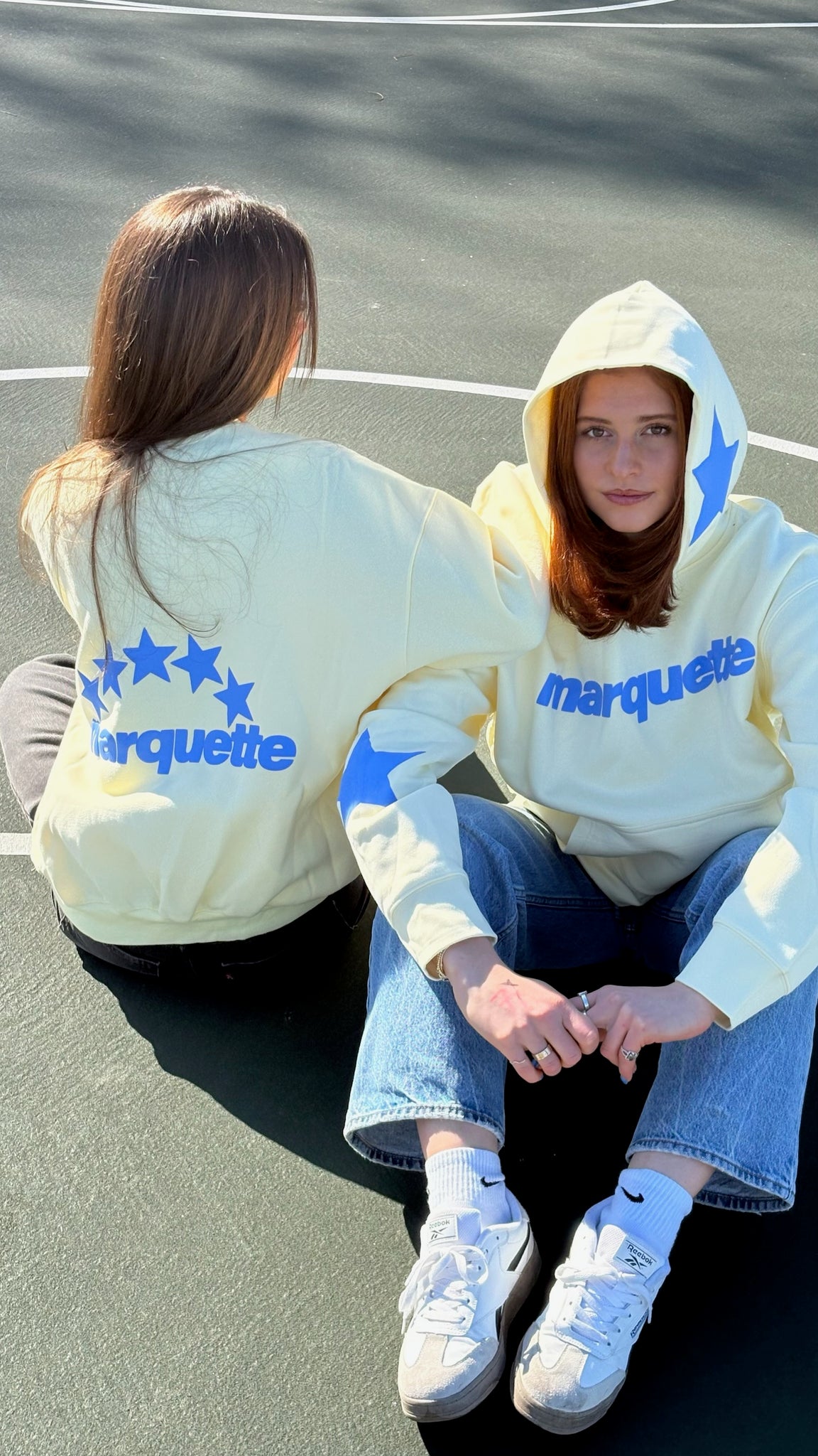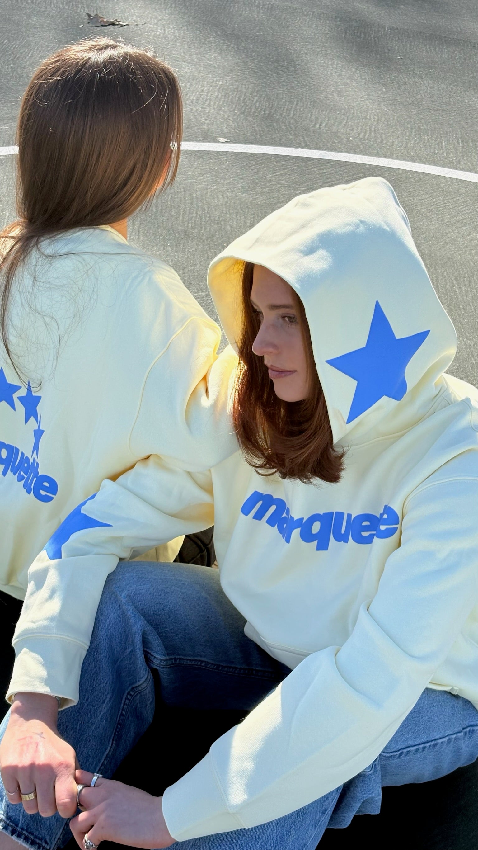 Hoodie with a relaxed, drop shoulder fit. Features marquette puff text and star accents on the hood and sleeve.