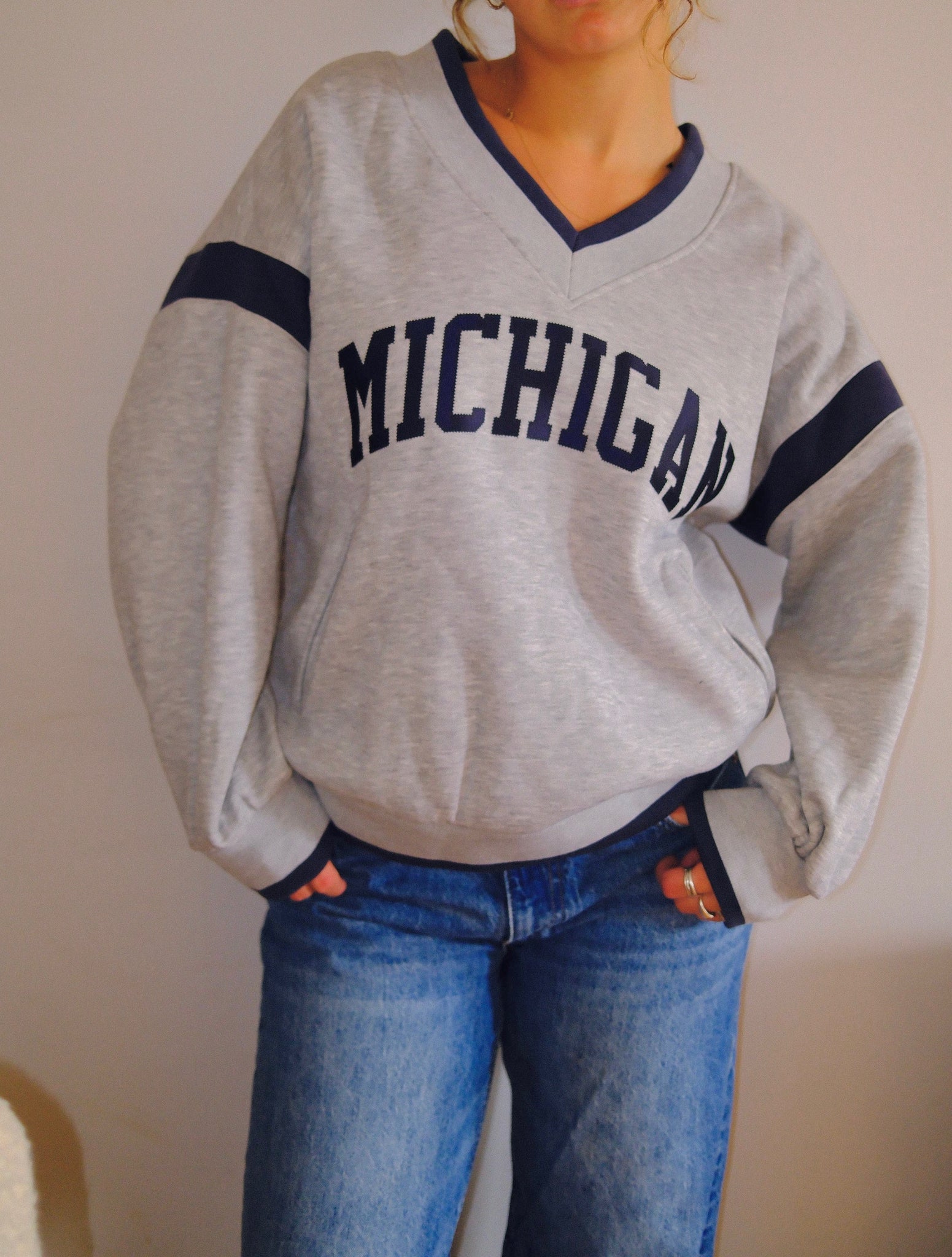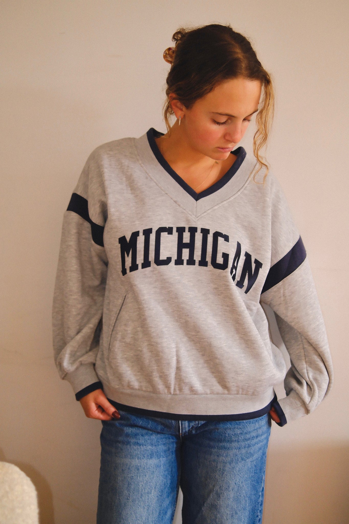 Show your Wolverine pride in laid-back style. With its vintage V-neck cut, bold Michigan lettering, and cozy relaxed fit, our homecoming crew is game day ready—and perfect for every day in between.