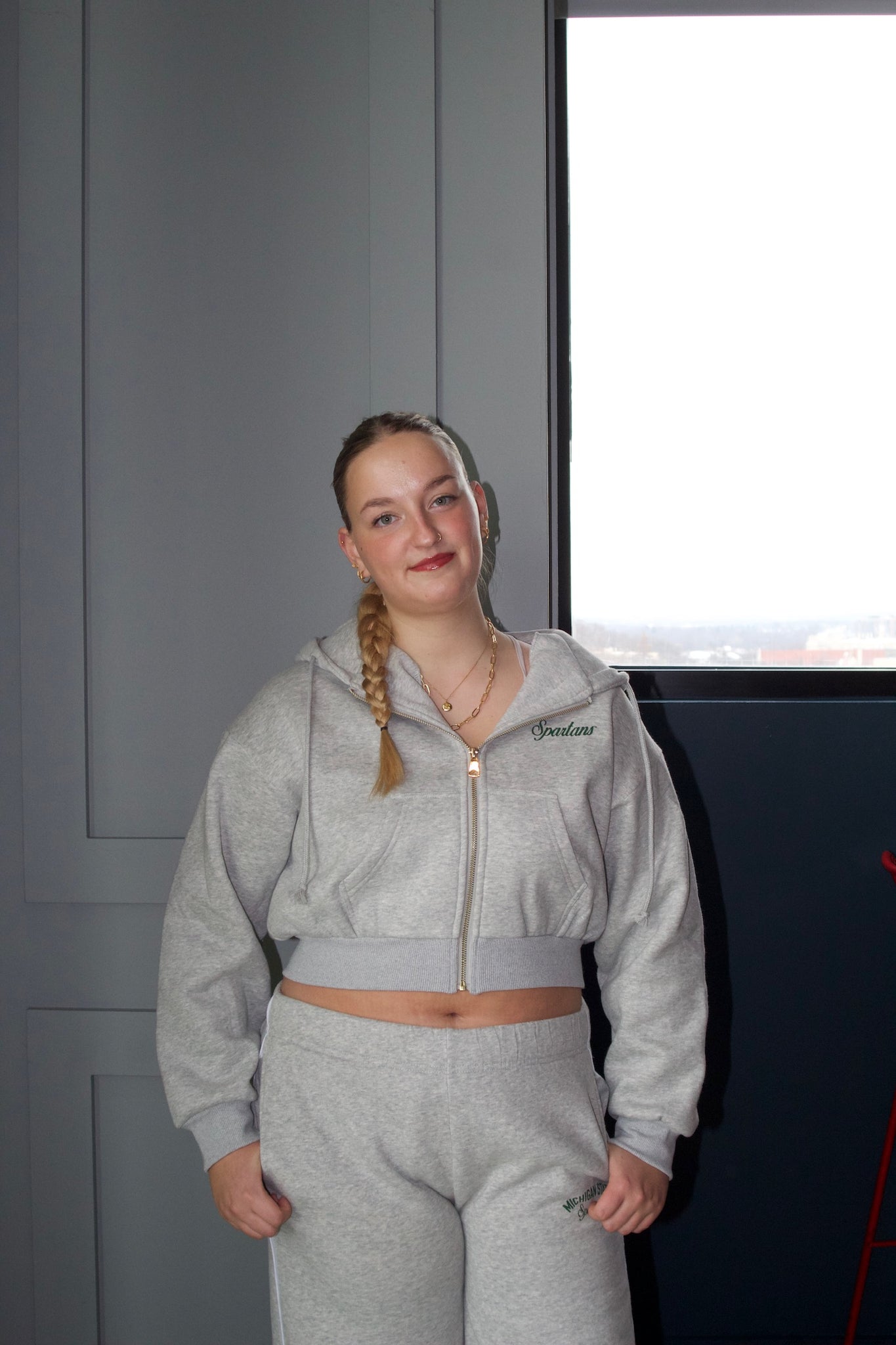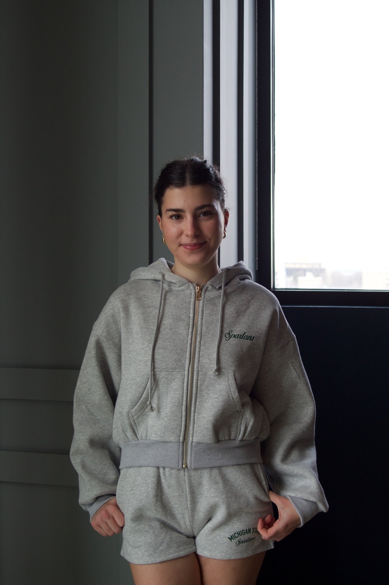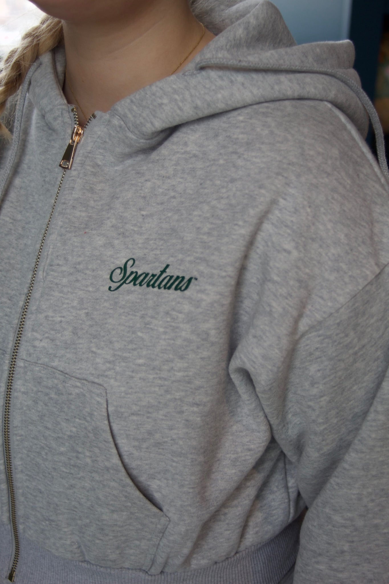 Layer up with the Michigan State Crop Full Zip, designed for effortless versatility. This oversized cropped silhouette pairs seamlessly with our sweat shorts for warm-weather styling or sweat pants for cozy comfort. This full zip is the perfect piece to mix and match throughout your wardrobe. Whether you're heading to campus or keeping it casual, this set-ready essential delivers both style and functionality.